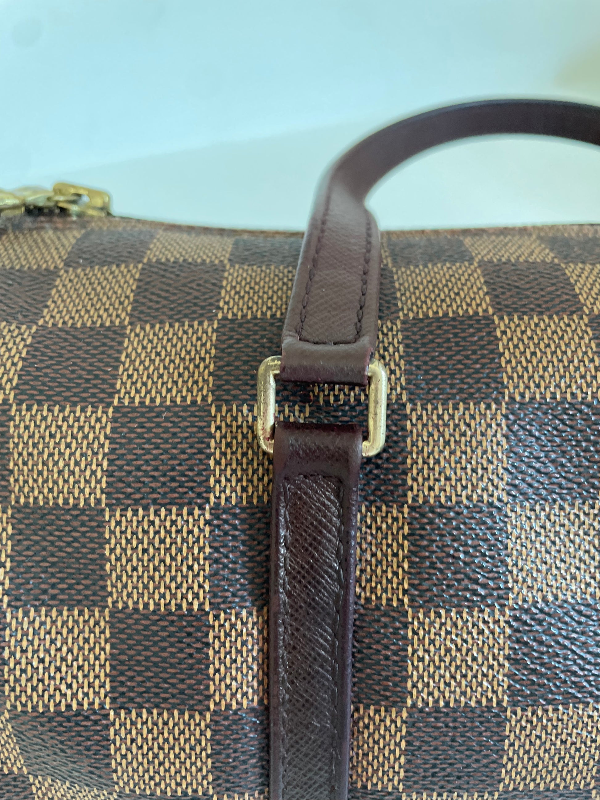 Matière : Toile Damier Ébène enduite & garnitures en cuir marron foncé